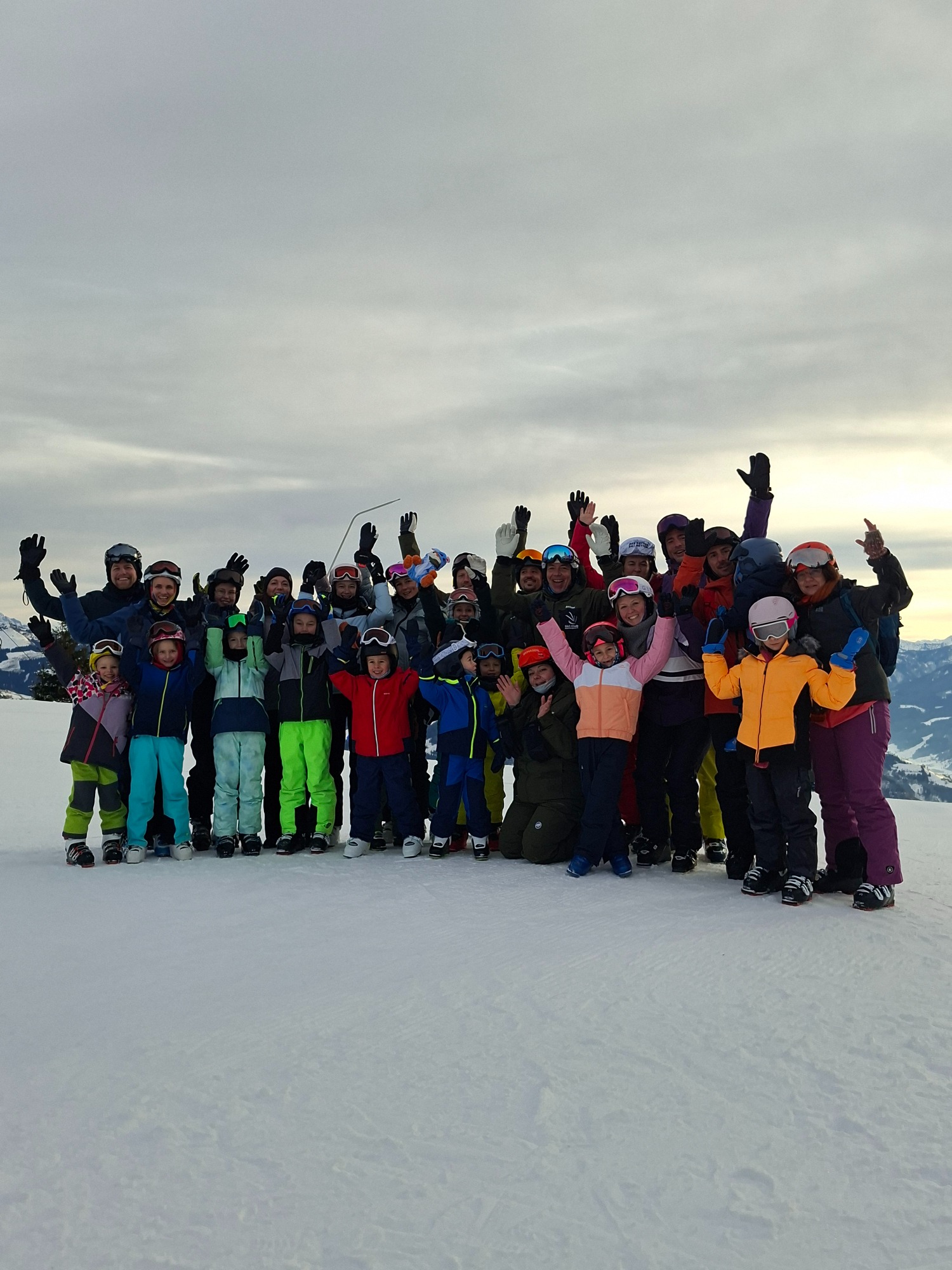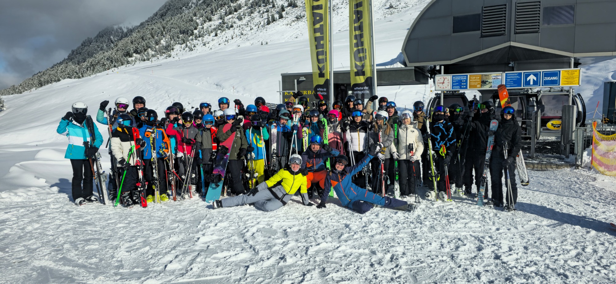 Die Sonne schien am Samstagmorgen durch die wenigen Wolken über die schneereichen Gipfel und die bestens gelaunten 51 Ski- und Snowboarder waren kaum zu bremsen. Noch schnell ein Gruppenfoto vor der Kaiser-Bahn, bevor in verschiedenen Gruppen die Pisten erobert wurden.